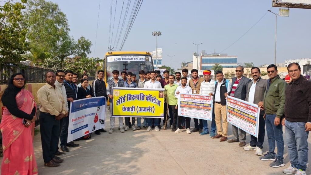 रक्तदान शिविर प्रभारी दिनेश वैष्णव ने बताया कि विशाल रक्तदान शिविर का आयोजन 5 दिसंबर को देवगांव गेट के पास आईसीआईसीआई बैंक के सामने स्थित अग्रवाल धर्मशाला में किया जाएगा। शिविर का समय प्रातः 9:00 बजे से दोपहर 3:00 बजे तक निर्धारित है।रैली में भारत विकास परिषद शाखा केकड़ी की ओर से—विकास रत्न गोपाल वर्मा,शाखा अध्यक्ष बहादुर सिंह शक्तावत,शाखा सचिव रामनिवास जैन,प्रांतीय कार्यकारिणी सदस्य कैलाश चंद जैन,दिनेश वैष्णव,वरिष्ठ सदस्य महावीर पारीक,पूर्व कोषाध्यक्ष भगवान माहेश्वरी,निहालचंद मेड़तवाल,गुलाबचंद सोमानी,महिला संयोजक अंजु विजय एवं एचडीएफसी बैंक से रवि जैन एवं विट्ठल छीपा,जबकि लॉर्ड तिरूपति कॉलेज से संस्था संरक्षक डॉ. आदित्य उदयवाल, डॉ. ज्ञानचंद जांगिड़, लालचंद साहू, पूजा शर्मा, रामप्रसाद कुमावत, विनीता माहेश्वरी, आकांक्षा पांचाल, दुर्गालाल कुमावत, मुख्तार मोहम्मद, ओमप्रकाश शर्मा और दुष्यन्त सेन रैली में सक्रिय रूप से शामिल रहे।